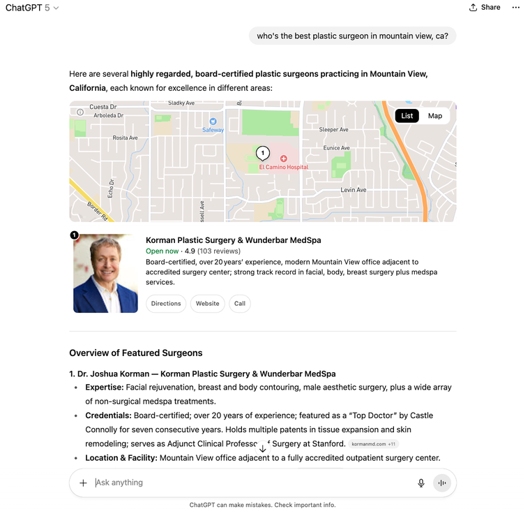 Despite Dr. Korman's stellar reputation and extensive online presence, the practice faced an emerging blind spot: AI-powered search. When prospective patients asked ChatGPT, Claude, or Perplexity "Who's the best plastic surgeon in Mountain View?" Dr. Korman wasn't being cited. Competitors with fewer credentials and lower patient satisfaction scores were appearing instead.