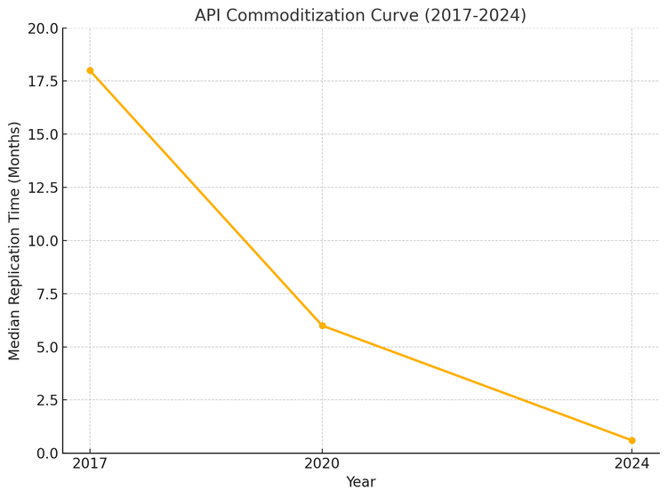 Using public datasets from RapidAPI, NPM trends, and GitHub forks, I modeled an "API Commoditization Curve," charting how fast a novel functionality becomes widely replicable after launch.
